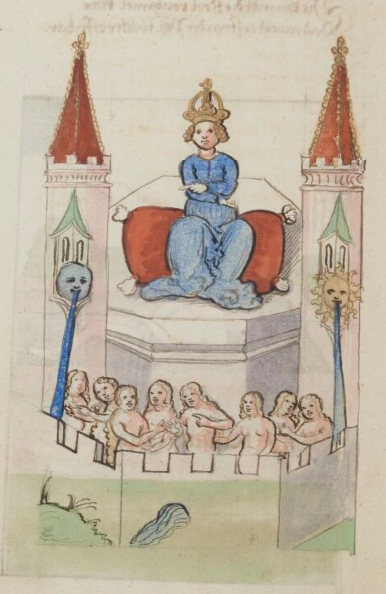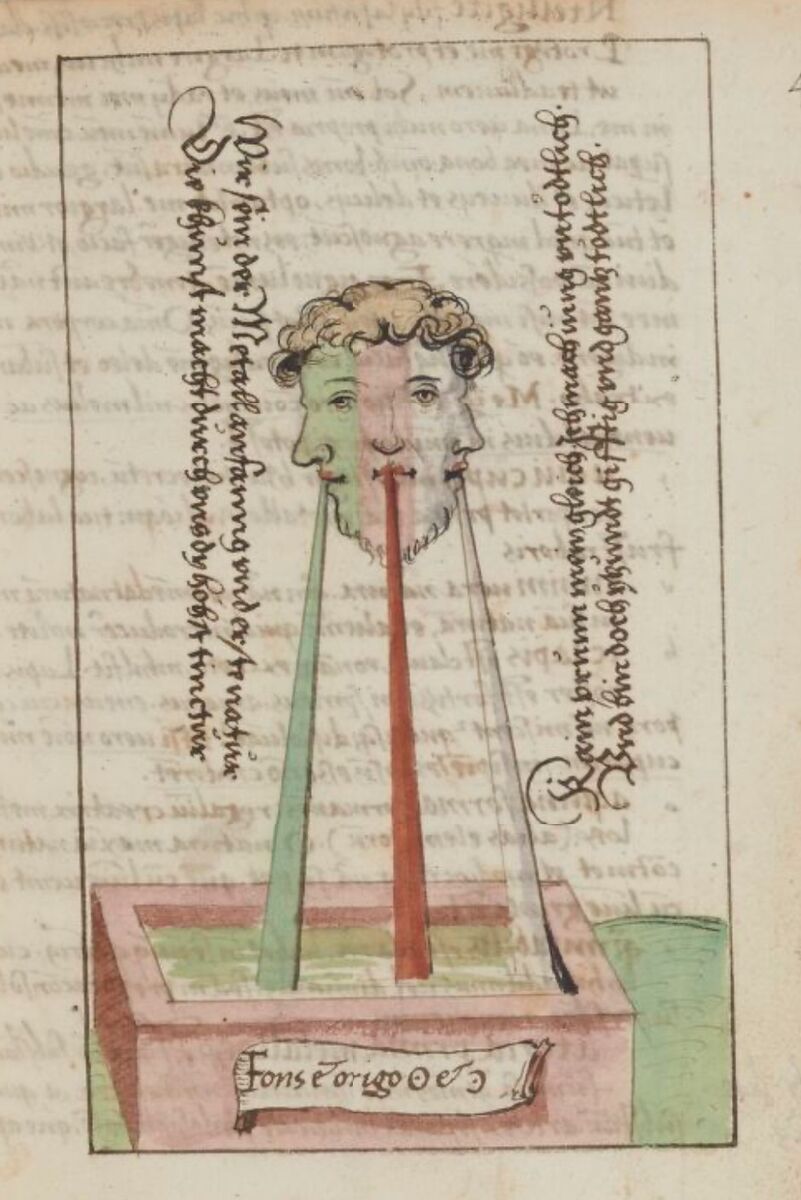 Алхімічний фонтан є символом Уробороса, первинної недиференційованої цілісності, образ хаосу Prima Materia. Три обличчя, що злилися в одне (як на мене, це відсилка до Гермеса Трисмегиста) і потоки представляють три принципи алхімії - Сірку, Ртуть (Меркурій) і Сіль - але все змішане у резервуарі фонтану, протилежності ще не диференційовані, є тільки потенціал золота у цьому неочищеному Меркурії (Monstrum Hermaphroditus). За Юнгом, це перший рівень розвитку свідомості - Містичне Співучастя (Participation Mistique), у якому жили наші давні предки без відчуття відокремленості себе від навколишнього світу та іншими. «Містичне Співучастя повʼязане з ідентифікацією свідомості людини з навколишнім світом без усвідомлення, що вона перебуває у цьому стані; свідомість та обʼєкт, з яким вона ідентифікується, містично злиті в єдине ціле» [13]. Свідомість починає розвиватися з відчуття свого тіла, тому Містичне співучастя переживається на рівні тіла - у фільмі ми бачимо на прикладі співзалежних стосунків, як це злиття проявляється тілесно: фантастичним чином тіла починають прилипати одне до одного, головний герой Тім переживає розлуку з Мілі фізичними муками і він старається якнайшвидше відновити з нею контакт, а потім їхні тіла прагнуть зростися між собою. Також яскравим образом у фільмі є епізод, коли під час сну волосся Біллі починає засмоктуватися ротом Тіма - це ж і є Уроборос. Взагалі для Юнга Містичне Співучастя в широкому сенсі означало можливість нашої свідомості поєднуватися з будь-якими обʼєктами та субʼєктами світу. Наприклад, ми можемо бути дуже привʼязані не тільки до певних людей, але й до улюблених речей.