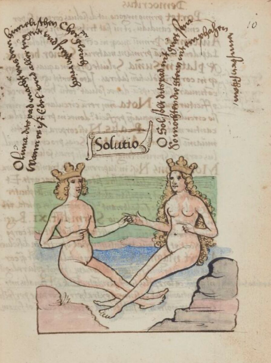 Це перше Згущення Солі і Сірки. У міжособистісній взаємодії це етап закоханості в Іншого. Через механізм безсвідомої проекції чоловік бачить у реальній жінці свою Аніму, ідеальний образ жінки у його душі, а жінка - Анімус, ідеальний сукупний чоловічий образ. Символ перехресного рукостискання (Король простягає свою ліву руку - свій безсвідомий Ерос, а Королева праву руку - свій безсвідомий Логос) і взаємопроникнення їхніх тонких тіл на малюнку вказує створення інтерактивного поля їхніх стосунків, у якому зʼявляються та активізуються безсвідомі діади у вигляді архетипових пар між Анімою та Анімусом. Щоб виникла сильна закоханість, завжди має констелюватися архетипова пара. Наприклад, це може бути Зевс і Гера, Шива і Шакті, Пігмаліон і Галатея, Іштар і Таммуз (богиня кохання та юний герой), Мудрий Старець та Юна Діва, Чоловік-Брат та Дружина-Сестра (описані детально Вереною Каст у праці «Пари» [17]); за Ліндою Леонард [18]: Казковий Принц і Прекрасна Принцеса, Примарний/Ідеальний Коханий і Кохана, Демонічний Коханець/Коханка і Жертва, Красуня і Чудовисько).