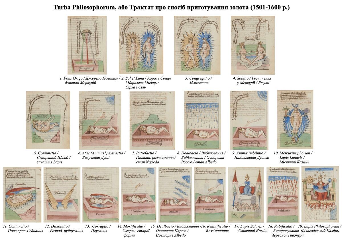 Більш детально поетапність Великого Діяння описувалася алхіміками у трактатах і супроводжувалася символічними зображеннями - гравюрами, можливо для кращого запамʼятовування і передачі таємного рецепту. Як я вже зазначала, кожен алхімік міг створювати власні унікальні сюжети гравюр або привносити нові деталі, але символічно вони передавали ту саму суть. У ХVІ ст. була популярна серія гравюр Rosarium Philosophorum, її багато разів перемальовували з різними варіаціями деталей і перевидавали, а пізніше багато дослідників, в тому числі Юнг, аналізували цей трактат. Саме Розаріум надихнув Юнга на його працю «Психологія перенесення». У свій час мене також заворожили ці образи, як і образ Андрогіна у дитинстві - тим більше, що цій серії він також є. Тому я послідувала за своїм інтересом і стала глибше вивчати дану тему. У процесі на просторах інтернету я натрапила на справжній скарб - відсканований повністю трактат тих же часів (дата написання стоїть 1501-1600 р.) з аналогічним сюжетом, як у Розаріумі, але без християнської символіки в останніх гравюрах і, як на мене з більш продуманою і чітко витриманою логіку процесів перетворення - це «Turba Philosophorum, або Трактат про спосіб приготування золота» [12]. У моїй першій версії даної роботи я провела невеликий порівняльний аналіз цих двох трактатів, але оскільки про Розаріум вже багато чого і досить ґрунтовно написано, я зосереджуся тільки на Turba Philosophorum. Я скрупульозно постаралася відновити оригінальні назви кожної гравюри, а також максимально коректно перекласти, щоб відобразити суть кожного етапу. Також, щоб аналіз був більш цікавий і приземлений до реалій динаміки звичайних стосунків у парі (підкреслю, що даною своєю роботою я намагаюся розкрити значення і роль стосунків, усіх їхніх злетів, розчарувань і болісних криз у процесі індивідуації), я паралельно буду наводити аналіз прикладів з кінофільму «Одне ціле» (Together, 2025). Цікаво подивитися на цей фільм як на фантазію режисера, який спроектував якийсь свій власний досвід переживань (навряд він щось знав про алхімічні трактати, у фільмі згадується лише міф про Платонівських андрогінів), або на сновидіння головного героя як на поклик Самості до індивідуації. Бо образи у фільмі вражаюче буквальні та емоційно насичені - дуже яскраво зображено те, що відбувалося на психологічному рівні стосунків героїв. Для початку для наочності приведу повну серію гравюр: перший ряд з чотирьох гравюр є попереднім етапом перед першим Coniunctio, два нижні - це 2 цикли трансформацій після Coniunctio для створення Філософського Каменю.