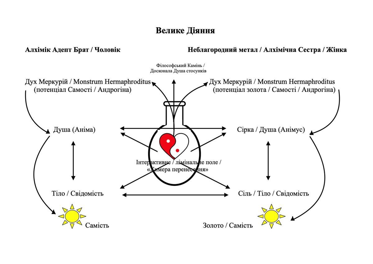 В її основі лежить Юнгівська схема перенесення і контрперенесення між терапевтом та клієнтом. Тут же, ми можемо уявити принцип створення Філософського Каменю і золота, а також розвиток психологічної близькості, що трансформує, між алхіміком чоловіком і алхіміком жінкою або просто між чоловіком і жінкою. Головною передумовою є уявлення алхіміків, що кожна жива істота та кожен неживий елемент природи містить у собі отой загадковий «Дух Меркурій», про який я вище писала, - він є потенціалом Самості нашого уявного алхіміка та алхімічної сестри і майбутнього золота у неблагородному металі (зачасту це був свинець, оскільки містив у собі всі необхідні протилежності елементів, щоб стати золотом після очищення Філософським Каменем). Також для алхімічного процесу потрібні: свідомий чоловічий принцип Логосу + протилежний свідомий жіночий принцип Еросу або алхімічна Сіль; Душа (Аніма/безсвідомий жіночий принцип Еросу) + у протилежності Душа (Анімус/безсвідомий чоловічий принцип Логосу) або алхімічна Сірка. Тож на початку алхімік зі своїм благородним свідомим наміром очистити свій Дух і створити Філософський Камінь бере Сіль і Сірку, уявно виділяє свій протилежний душевний принцип (це простіше зробити, якщо він реально працює в парі з алхімічної сестрою) і розпочинає хімічні операції з розчинення Солі та Сірки у Ртуті - універсальному агенті трансформації (Prima Materia) і єдиним середовищем, здатним здійснити розчинення та нове обʼєднання (Coniunctio). Ртуть (Меркурій) є Духом, здатним розділити тверде Тіло (Сіль) та закріплений Дух (Сірку) на їхні найчистіші компоненти. Вона єдина могла розчинити (Solutio) існуючі звʼязки, щоб створити нові, досконалі - це алхімічний принцип Solve et Coagula (Розчиняй і Згущуй). У міжособистісній же взаємодії таким розчинником і обʼєднувачем є безсвідоме інтерактивне/лімінальне поле перехресних проекцій. Якщо є необхідна напруга між протилежностями і Аніма та Анімус констелюються у взаємодоповнюючій діаді, відбувається перше Coniunctio. Зароджується Душа цих стосунків, але й також утворюється «химера перенесення» (отой алхімічний Гермафродит першого обʼєднання Солі з Сіркою), яка має пройти неприємний етап Nigredo, де вже констелюватимуться тіньові аспекти протилежностей, бути заново розділена і очищена. Коли всі етапи очищень, розділень, інтеграцій протилежностей у кожного з пари в інтерактивному полі будуть пройдені, винагородою буде Досконала Душа стосунків - те третє, що очистить недосконалий Дух, обʼєднає його з Душею і відкриє доступ до Самості. У випадку роботи з матеріалом - кінцевим результатом Діяння буде Філософський Камінь (алхіміки його описували як червоний кристалічний порошок - Червона Тінктура) - і саме він зможе таким чином очистити Дух Меркурій свинцю, що він стане золотом. Ще важливий нюанс - для всього цього містичного процесу необхідна герметична алхімічна колба (Vas Hermeticum), а в міжособистісному просторі - довіра, близькість і безпека. Тільки так може статися магія Священного Шлюбу протилежностей, а також народження і розвиток їхнього спільного Третього.