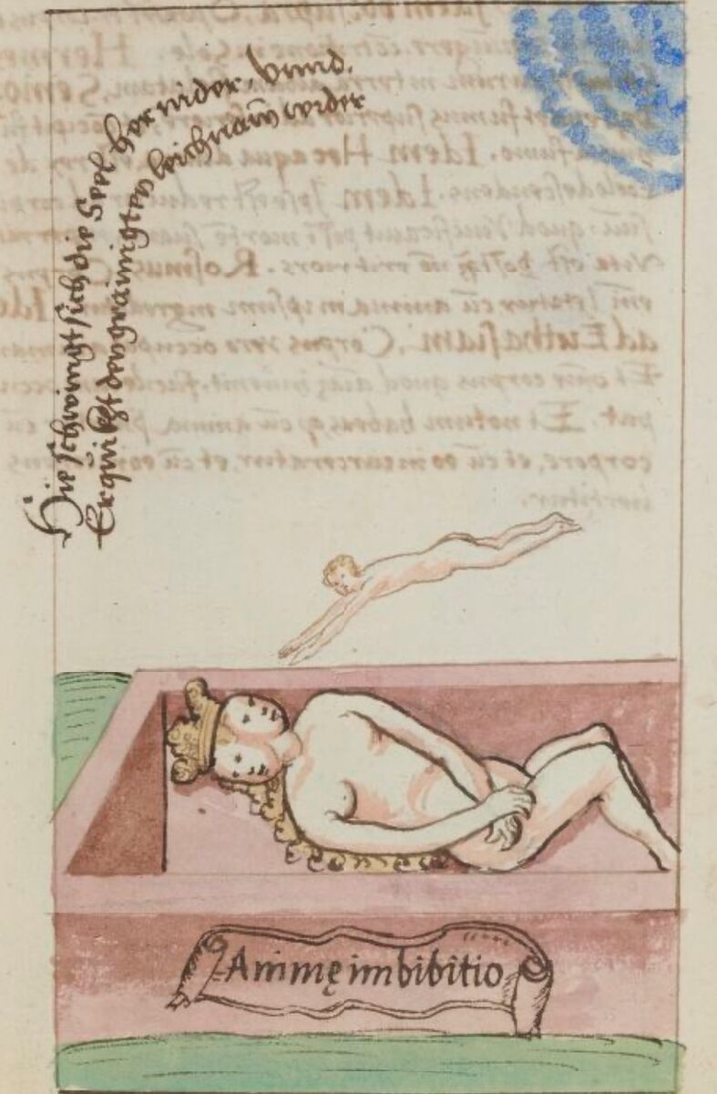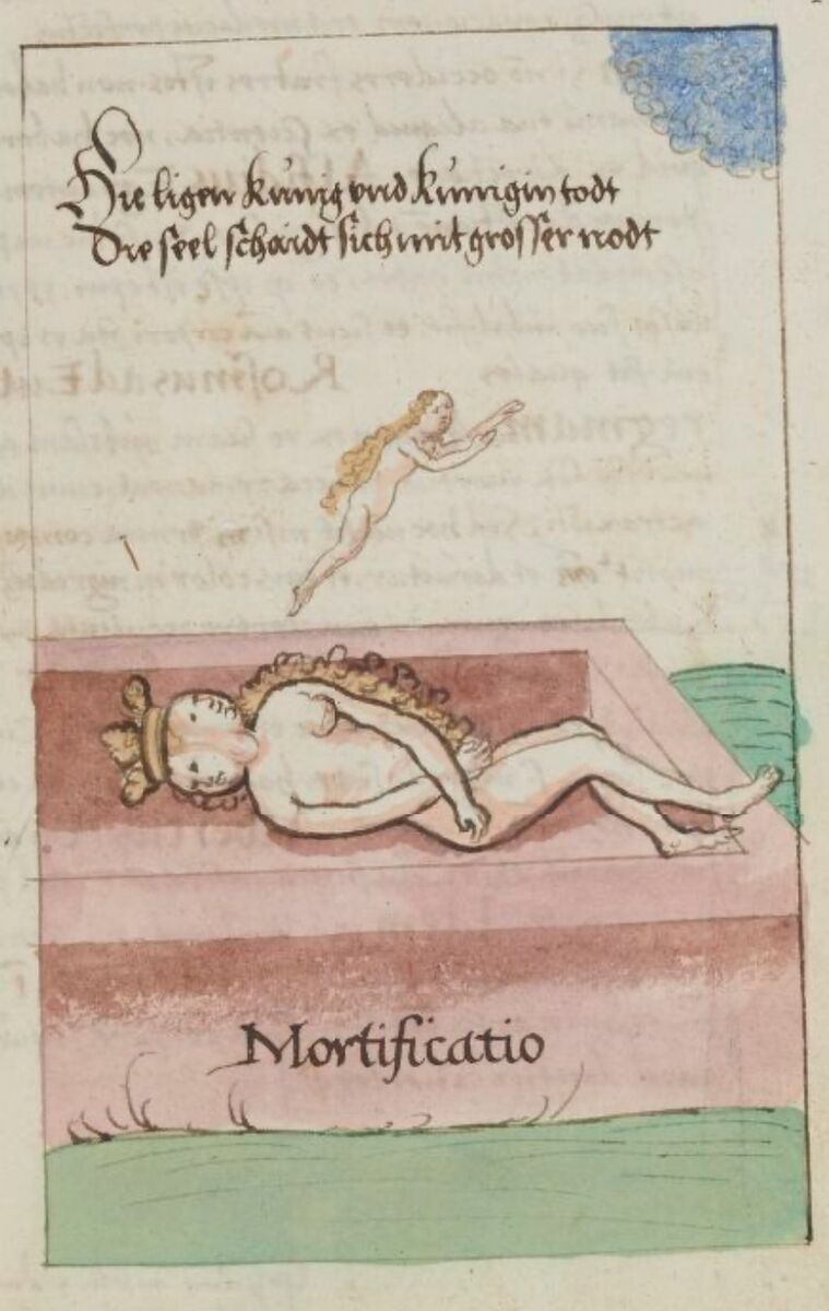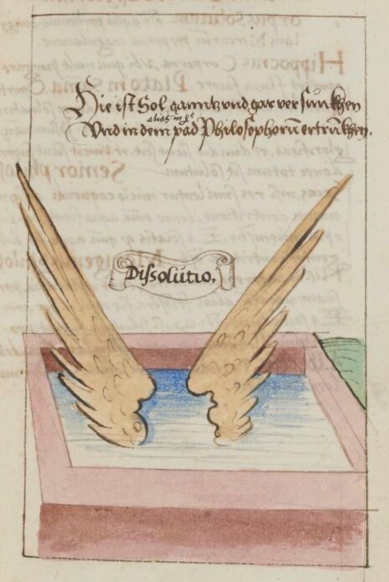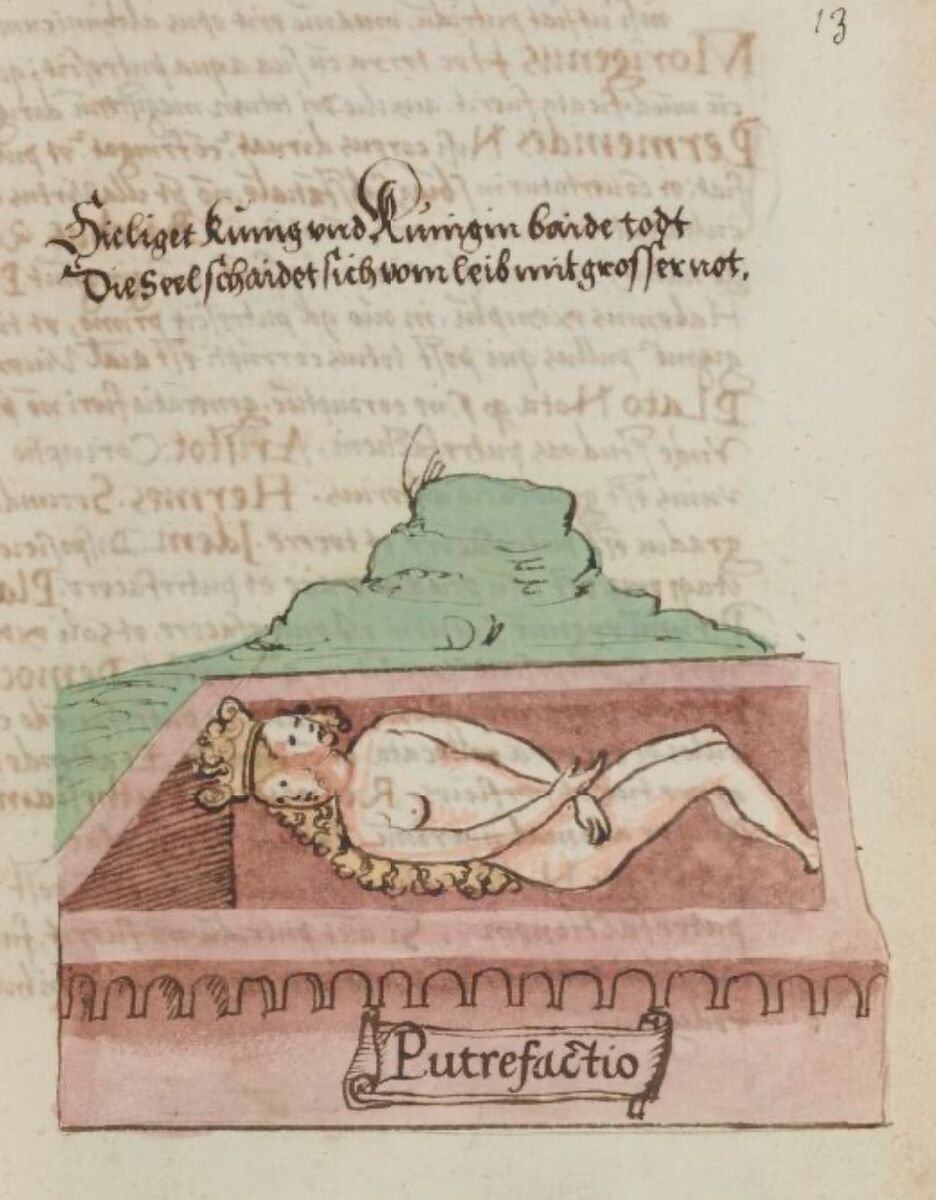 На цьому етапі сполуку з Солі і Сірки має покинути їх спільний новонароджений Дух Меркурій, тонка матерія - це метафора хімічної реакції випаровування. В осаді на дні алхімічної колби лишається груба матерія, яка має пройти етап почорніння (Nigredo) та очищення. Символічно груба матерія тут зображена у вигляді Гермафродита, утвореного з тілесного злиття «батьків» майбутнього Філософського Каменя, а тонка матерія - у вигляді гомункула чоловічої статі (символ незрілого, але чистого Анімусу, чоловічого принципу Логосу), що покидає тіло Гермафродита у труні для того, щоб інша його протилежність (фемінний принцип Еросу) очистилася у тілі (зверніть увагу, що впродовж першого циклу розділення і нігредо саме Королева лежить в нижній частині тіла Гермафродита з закритими очима).